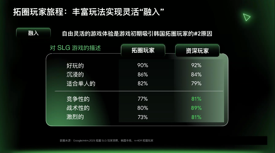 一位韩国玩家则反馈称,他从零基础开始,逐渐被故事和角色养成吸引,获得成就感的同时也越来越理解SLG的玩法。柯光信对此评价,“这正是过去一两年轻度化 SLG 拓圈取得成功的原因,即抓住了非核心 SLG 玩家的兴趣和需求,让他们逐渐深入并参与其中。”