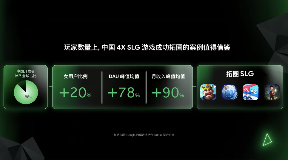 Google在和几位头部 SLG 厂商探讨的过程中,所达成的共识在于中国开发者在全球SLG领域具备明显优势。一方面,中国本土市场的 SLG 品类体量非常大,产业积累深厚,对这一赛道的理解非常深刻。另一方面,中国开发者在迭代速度和思维转换上非常突出。他们普遍持开放心态,愿意试错,执行力强,能够快速进行迭代,并且具备极高的韧性和持续性。