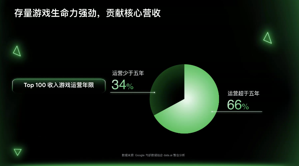 但光有破圈还不够,如何让游戏长线运营同样重要。过去十年,新游戏发行数量在 2018年达到顶峰后逐年下降,这意味着手游行业已经从粗放式探索转向精细化运营。如今在海外市场收入Top 100中,运营五年以上的长青型游戏占比越来越高。