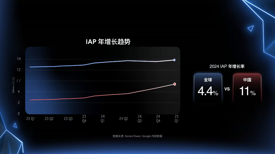 柯光信谈到,中国游戏产业开拓海外市场已有多年。2018年,在美国市场收入Top 100的手游中,中国开发者仅占11个,而今年这一数字已提升到27个,这一变化说明中国游戏的出海成果斐然,过去几年取得了长足的进展。参考2024年成绩,全球IAP的年增长约为4.4%,而中国开发者的整体增长率达到11%,显著跑赢大盘。这背后是开发者展现出的强大韧性、快速迭代的能力以及对新机会的开放心态。