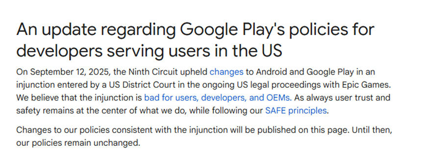 2025年9月中旬,Google Play开发者后台发布题为"An update regarding Google Play's policies for developers serving users in the US"的政策声明,正式回应美国司法程序对应用市场规则的重塑。该声明明确提及,美国第九巡回上诉法院当天维持了地区法院在Epic Games反垄断诉讼中对Android及Google Play下达的禁令修改,标志着这一牵动行业的反垄断裁决正式生效。谷歌在声明中表达了对生效裁决的异议,强调"该禁令对用户、开发者和设备制造商均不利",同时重申"用户信任与安全始终是我们工作的核心,并将遵循SAFE原则"。