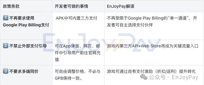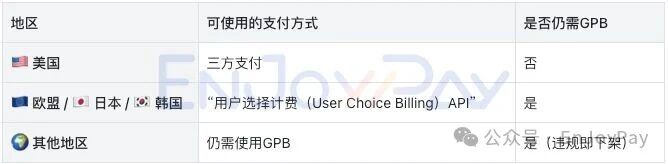 如果游戏开发者在美国区上架,同时也服务欧洲或亚洲玩家,那么请确保仅对美国区用户开放第三方支付,其他地区仍使用Google Play Billing(GPB)或当地监管认可的替代方案。