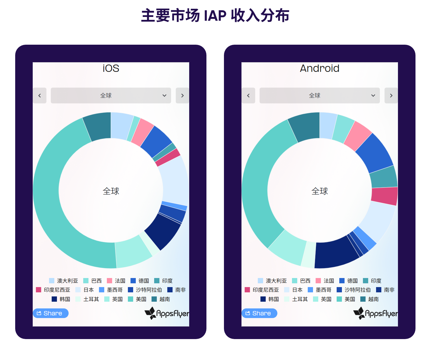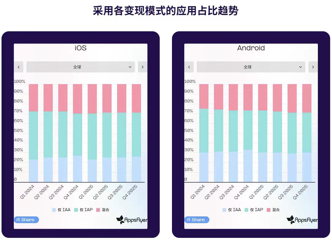 2.平台区别:Android转型加速,iOS内购集中。报告显示,Android平台IAA 模式正逐步让位于混合变现。博彩游戏IAP虽平均占比达72%,但仅采用IAA的博彩产品数量已下降33%,同时采用混合模式的游戏比例增长近20%。中度游戏的变现结构则更为集中:虽然仅采用IAA的中度游戏数量同比下降12%,更多产品逐步向混合模式转型,但仍有80%仅依赖IAP。随着开发与获客成本持续上升,复杂品类仅依赖IAA的变现模式已难以为继。