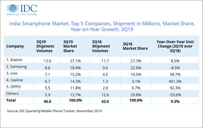IDC 数据显示,2019 年第三季度印度智能手机出货量同比增长 9.3%,其中小米(1260 万部)、三星(880 万部)、vivo(710 万部)、realme(670 万部)、OPPO(550 万部)排名为出货量前五。