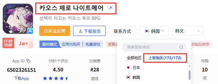 榜单方面,游戏首日登上 12 个区域市场 iOS 游戏免费榜 TOP50(登顶日本和中国港台,位于韩国第 3、新加坡第 2、中国第 13 —次日上升至第 6 名的峰值),但之后排名下滑严重,目前在中国台湾、韩国以及日本表现较为亮眼,分别位于免费榜第 42、第 22 以及第 8;