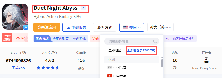 10 月 28 日,万众期待的《二重螺旋》正式开启全球公测,当天登上 30 个区域市场 iOS 游戏免费榜 TOP50(登顶中国以及中国港澳台,位于日本第 2、韩国第 5、美国第 13),游戏畅销榜也在冲榜阶段,当前位于中国第 76、中国台湾第 44、韩国第 61、日本第 66。整体榜单成绩还算可观。