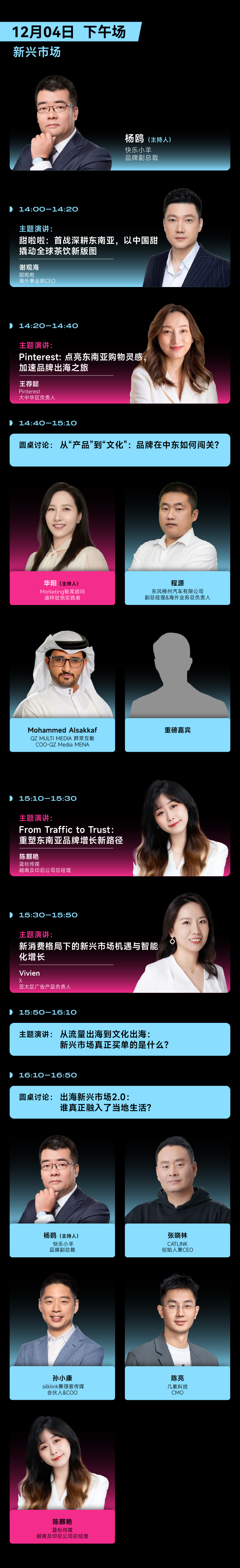 针对东南亚市场,CATLINK创始人兼CEO张晓林、SILKLINK赛翎客传媒合伙人&COO孙小康、几素科技CMO陈亮 、蓝标传媒越南及印尼公司总经理陈麒艳,将与主持人快乐小羊品牌副总裁杨鸥,以《出海新兴市场 2.0,谁真正融入了当地生态?》为主题展开讨论。