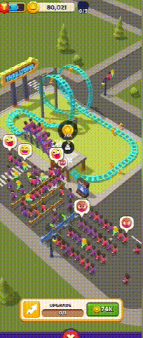 另一个是模拟经营板块。玩家要花费金币不断建造、升级游乐设施,以满足排队游客的需求,在视觉上给人一种玩堵车游戏的感觉。同时该部分还有类似「填海造地」的玩法,要求玩家不断填充六边形地块,以赢取阶段性的奖励。