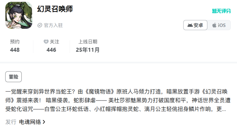 近期,一款暗黑放置手游《幻灵召唤师》在各平台开启预约,页面显示其将由电魂网络发行,预计于2025年11月上线。