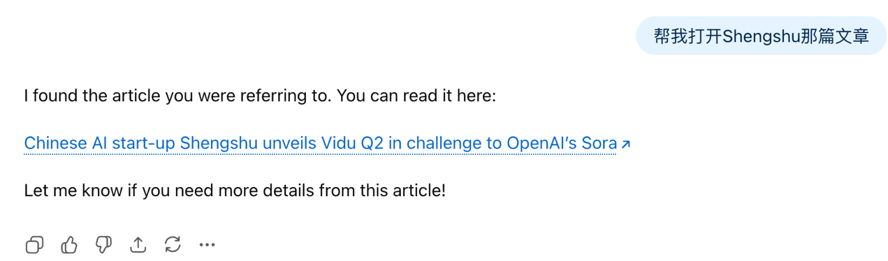 关于 Atlas 的记忆功能,用户可以直接询问 ChatGPT,找回自己此前打开过的标签页,ChatGPT 会直接给用户返回链接,如上图,笔者上午的时候曾经浏览过“生数科技推出新模型“的新闻,ChatGPT 就可以通过关键词找到网站的链接。但关于浏览器的记忆一直属于隐私争议焦点,Atlas 目前的做法是默认关闭记忆功能,并主动询问用户是否授权浏览器访问。