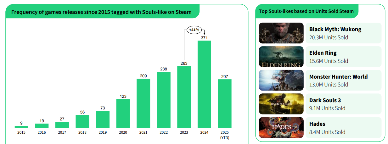 巅峰期(2019 年):独立游戏《哈迪斯》《噬血代码》和《渎神》与 3A 大作《只狼:影逝二度》《星球大战绝地:陨落的武士团》等同年发售,共同创造了创纪录的销量,将类型热度推向高峰。