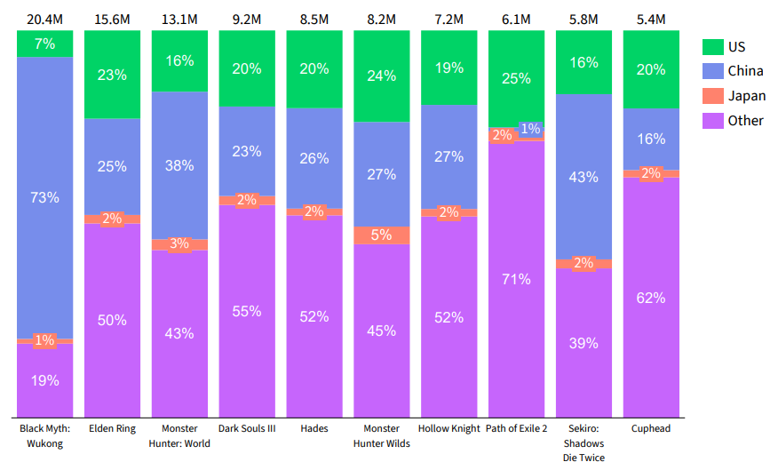 而其中的中国玩家,除了为《黑神话》创造了超过七成的销量外,也平均为《艾尔登法环》《怪物猎人荒野》《空洞骑士》等 Steam 魂类标签的游戏产品创造近三成的销量。