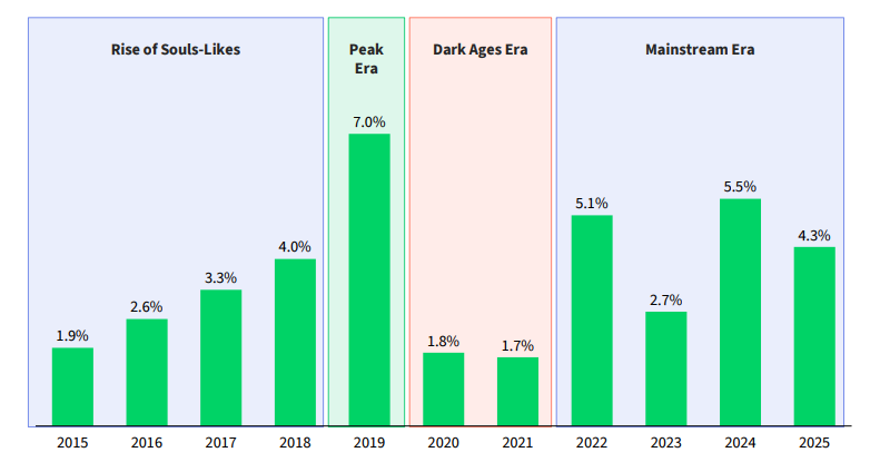 基于类魂游戏在整个 Steam 市场的上架数占比,VG Insights 将类魂产品的发展分成了四个阶段: