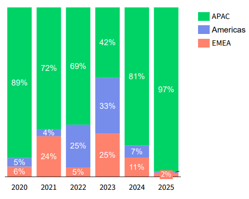 在 2020-2025 年期间,类魂游戏在 Steam 端的重心飞速向亚洲市场靠拢。在 2025 年,亚洲开发者的类魂游戏在全球占比八成,创造了整个品类 97% 的销量。