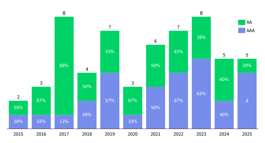 Steam 平台 3A(蓝色)及 2A(绿色)类魂游戏发行数量对比