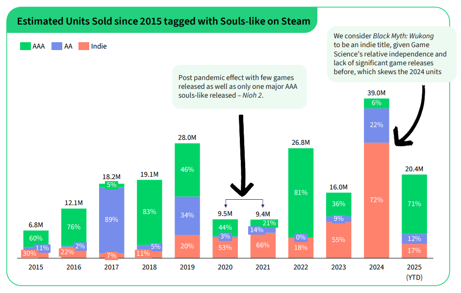 到了 2024 年,在《黑神话悟空》(在图表中被归类为独立游戏)的推动下,Steam 平台的类魂游戏产品预估售出高达 3900 万份。且 3A 发行商现已实现对类魂市场的强势主导。