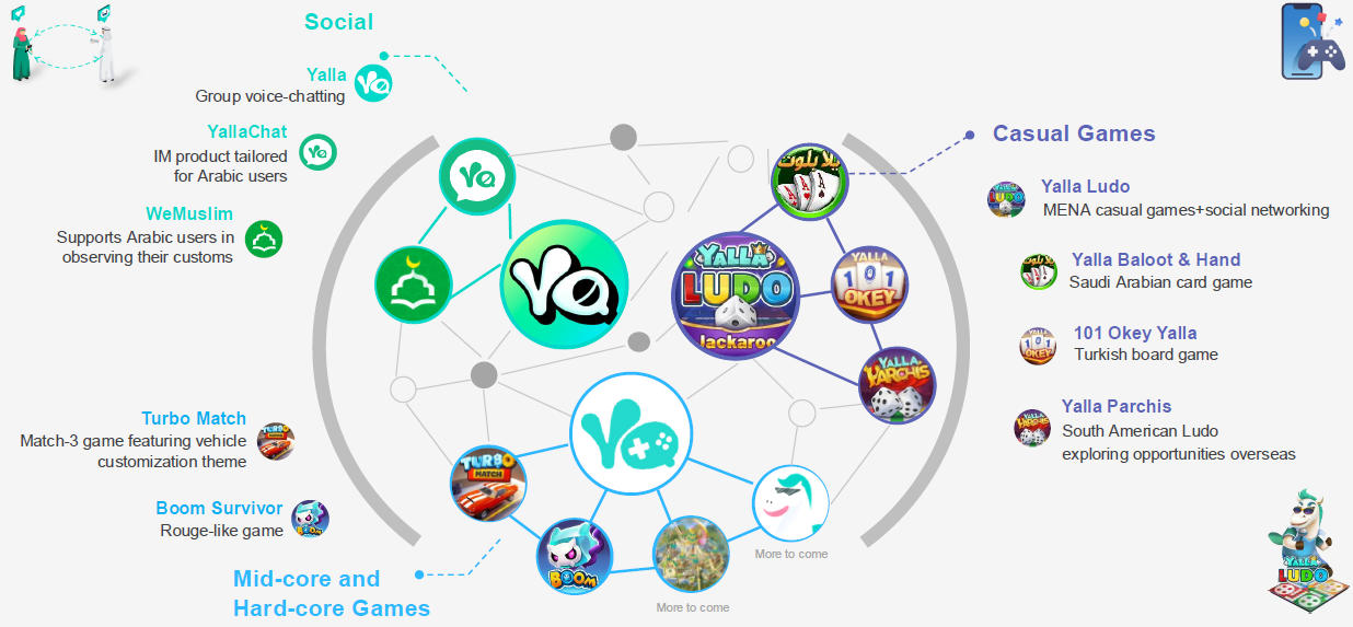 Yalla Group 目前业务生态结构,值得注意的是划分为“中重度游戏业务”的版块内出现了新品「Turbo Match」和「Boom Survivor」 | 图片来源:Yalla Group