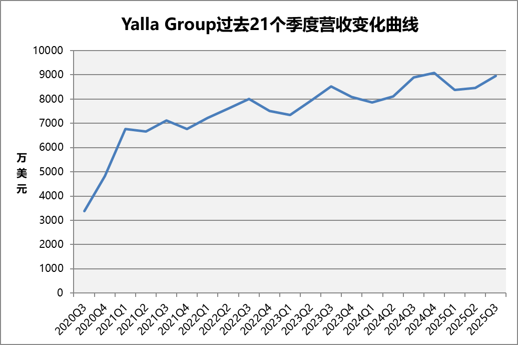 Yalla Group 2025 年 Q3 总营收达到 8960 万美元,同比增长 0.8%,刷新 2020 年以来 Q3 流水新高 | 数据来源:Yalla Group