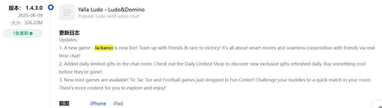 更新历史显示,「Yalla Ludo」从今年 6 月 9 日开始加入了另一个中东本土高人气桌游玩法 Jackaroo | 图片来源:点点数据