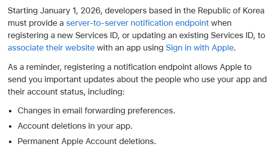 前段时间,苹果开发者官网发布针对韩国市场的重要政策更新,明确自 2026 年 1 月 1 日起,在韩发布应用且使用“通过 Apple 登录”(Sign in with Apple)功能的开发者,必须在注册或更新“服务 ID”时提供服务器对服务器(S2S)通知端点。这一要求关系到应用能否顺利上架韩国区 App Store,对于计划进军韩国市场的开发者,深入理解新政细节并提前部署应对方案已成为当务之急。