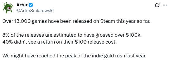 正如开发者 Artur 所言:“我们可能去年已经达到了独立游戏淘金热的顶峰。”当淘金者数量远超金矿存量时,多数人只能空手而归。